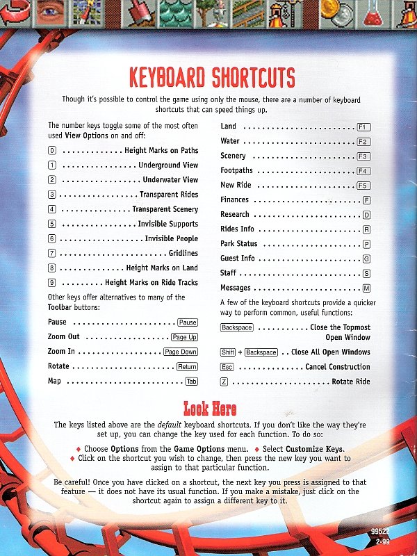 These are b&w PDF scans of the RollerCoaster Tycoon User Manual, the supplemental LoopyLandscapes User Manual, and the RCT Strategy Guide. These books are offered only for reference purposes, as some of the information contained in them has been proven to be incorrect. All the important information from these books, and far more, can be gleaned from instead reading the "Definitive RCT Reference Guide":