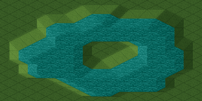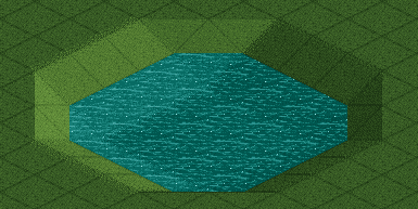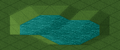 It's a bit better, isn't it? By doing this, we're rid of the square edges and it also follows a simple rule of physics: water always falls downward. Therefore, all bodies of water are lower than the ground surrounding it. The first picture's water level was equal with the ground, which you will never see in nature. The second one has the water level at five feet lower than the regular flat grass. You may choose to lower your level of water, but I feel that this usually suits it best.