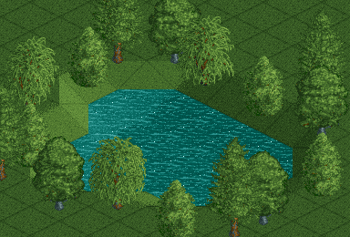 However, there is still something wrong with it. Can you spot it? If you can, good work. If you can't, go away and never play RCT again. I'm kidding, but it's rather obvious that the pond still has a general "square" feel to it with the edges cut off. Not too nature-like, eh? Of course not. Try creating a more random shape when creating a pond, lake, or ANY body of water that's not a fountain. Try making small bays and peninsulas or just alter the shape until you feel it's balanced and natural. Utilizing the same space as the first two pictures, I created the below pond.